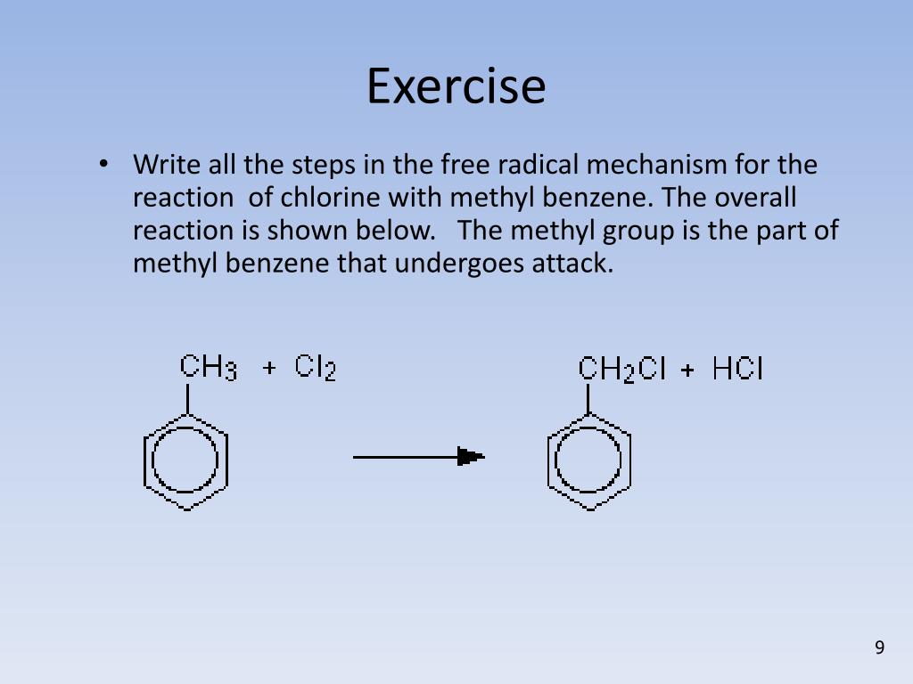 Exercise • Write all the steps in the free radical mechanism for the reaction of chlorine with methyl benzene. The overall reaction is shown below. The methyl group is the part of methyl benzene that undergoes attack. 9