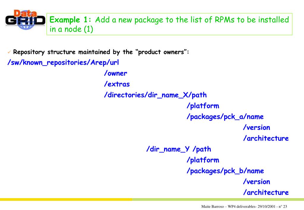 Example 1: Add a new package to the list of RPMs to be installed in a node (1) • Repository structure maintained by the “product owners”: /sw/known_repositories/Arep/url /owner /extras /directories/dir_name_X/path /platform /packages/pck_a/name /version /architecture /dir_name_Y /path /platform /packages/pck_b/name /version /architecture