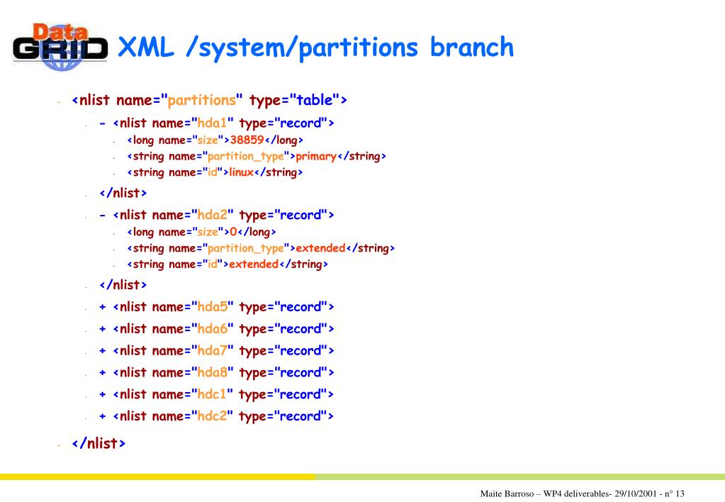 XML /system branch • <nlist name="system" derivation="testbed001"> • <string name="hostname">testbed001</string> • <string name="architecture">i386_rh62</string> • <string name="localdomain">cern.ch</string> • + <nlist name="pam" type="table"> • + <nlist name="nsswitch" type="record"> • + <list name="inetd"> • + <nlist name="partitions" type="table"> • + <list name="filesystems"> • + <list name="network_interfaces"> • + <nlist name="dns" type="record"> • + <list name="services"> • + <nlist name="time"> • </nlist>