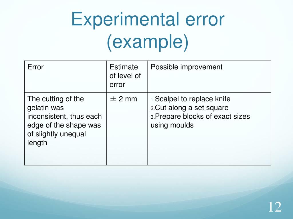 Uncertainty calculation example Length: ±0.5mm (systematic) Maximum uncertainty: 0.5 mm/9mm x 100% = 5.56% Mean uncertainty = 0.5/15 x 100% = 3.33% Time: ±0.005s (absolute) Uncertainty: 0.005s/600s x 100% = 0.001% Total maximum uncertainty = 5.56%