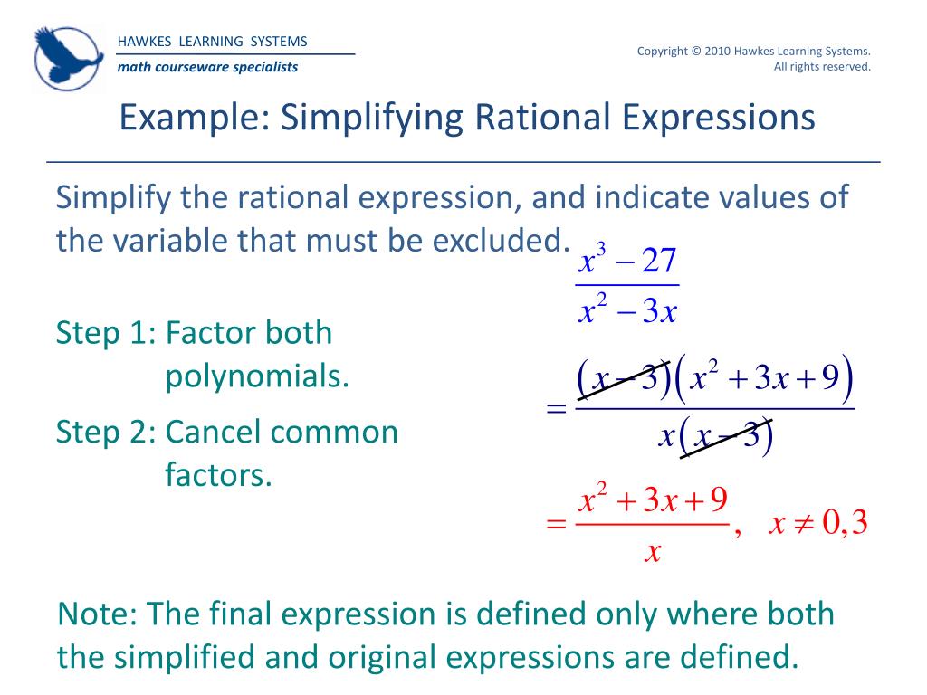 Example: Simplifying Rational Expressions Simplify the rational expression, and indicate values of the variable that must be excluded. Step 1: Factor both polynomials. Step 2: Cancel common factors. Note: The final expression is defined only where both the simplified and original expressions are defined.