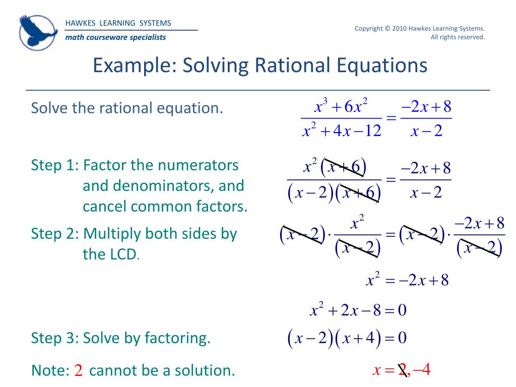 Example: Solving Rational Equations Solve the rational equation. Step 1: Factor the numerators and denominators, and cancel common factors. Step 2: Multiply both sides by the LCD. Step 3: Solve by factoring. Note: cannot be a solution.
