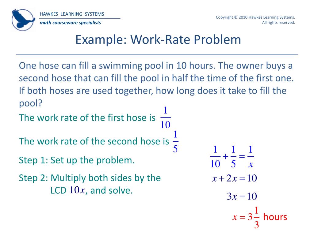 Example: Work-Rate Problem One hose can fill a swimming pool in 10 hours. The owner buys a second hose that can fill the pool in half the time of the first one. If both hoses are used together, how long does it take to fill the pool? The work rate of the first hose is The work rate of the second hose is Step 1: Set up the problem. Step 2: Multiply both sides by the LCD , and solve. hours