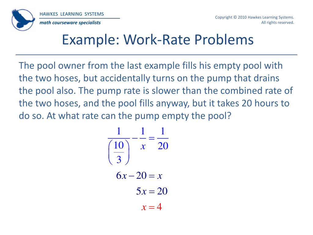 Example: Work-Rate Problems The pool owner from the last example fills his empty pool with the two hoses, but accidentally turns on the pump that drains the pool also. The pump rate is slower than the combined rate of the two hoses, and the pool fills anyway, but it takes 20 hours to do so. At what rate can the pump empty the pool?