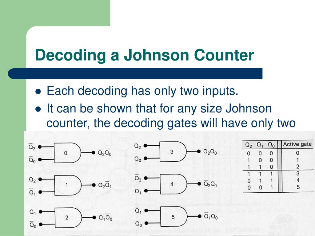 Decoding a Johnson Counter • Each decoding has only two inputs. • It can be shown that for any size Johnson counter, the decoding gates will have only two inputs.
