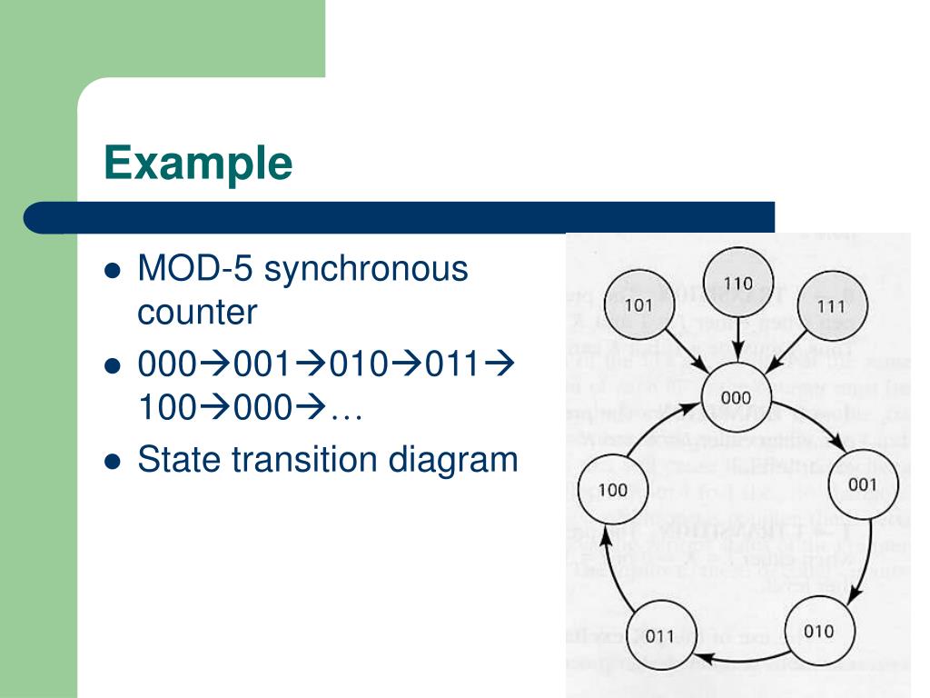 Example • MOD-5 synchronous counter • 000001010011100000… • State transition diagram