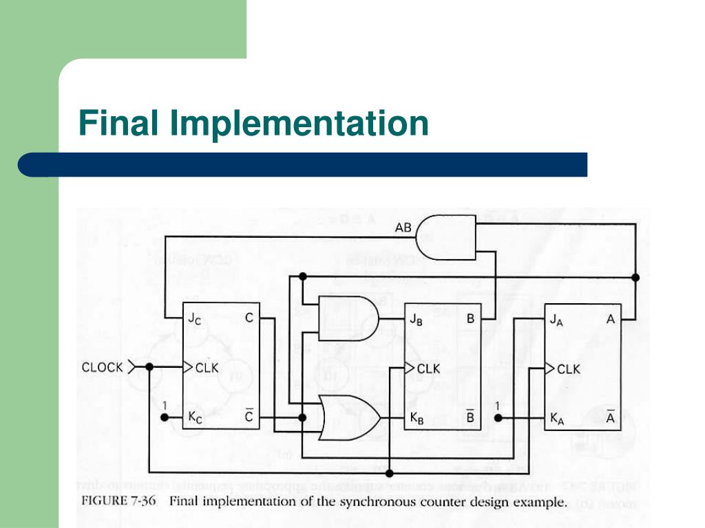 Design Procedure (cont’d) • Step4: Add a column to the above table for each J and K input to produce a circuit excitation table. • Step 5: Design the logic circuits to generate the levels required at each J and K input. • Step 6: Implement the final expressions.