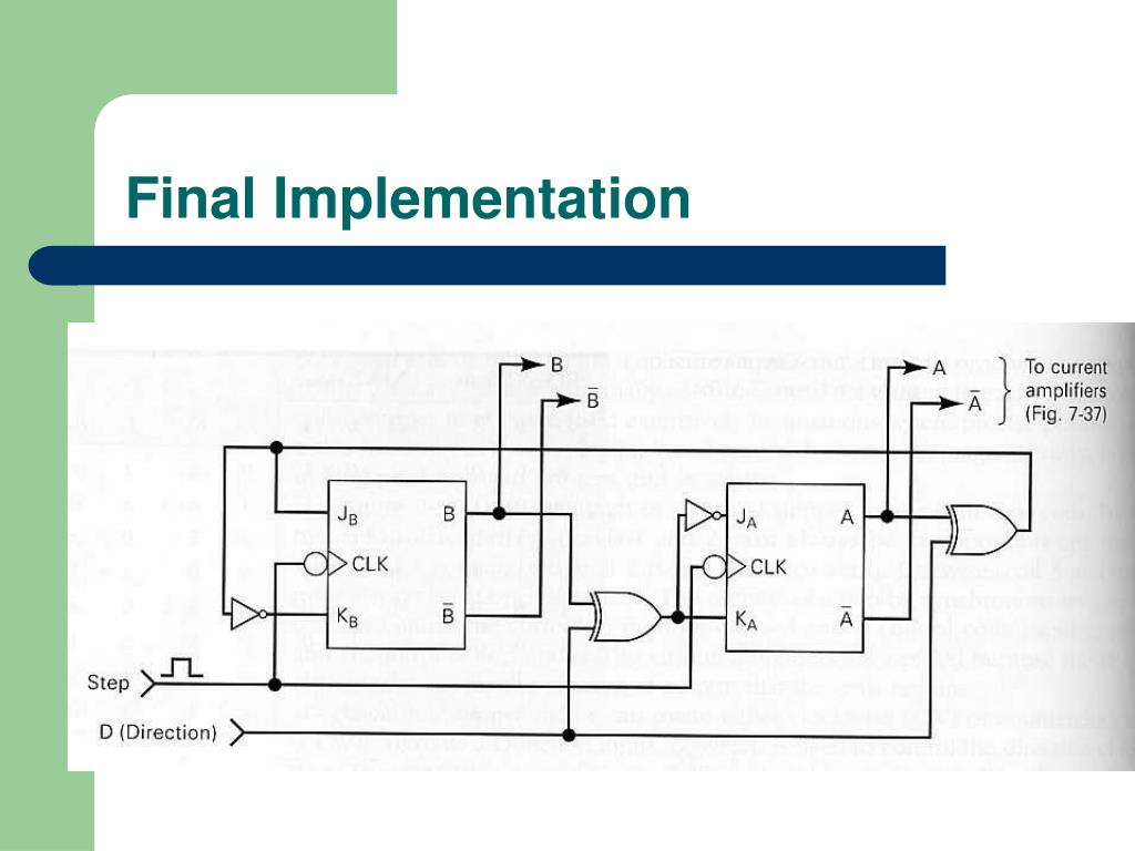 Step Motor Control • A step motor is a motor that rotates in steps rather than in a continuous motion, typically 15 degrees per step. • Used in positioning of read/write heads on magnetic tapes, in controlling print heads… • Figure 7.37: CW rotation and CCW rotation. • Apply the design procedure to generate the circuit.