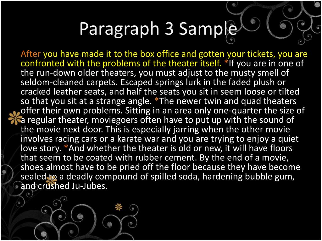 Paragraph 3 Sample Afteryou have made it to the box office and gotten your tickets, you are confronted with the problems of the theater itself.*If you are in one of the run-down older theaters, you must adjust to the musty smell of seldom-cleaned carpets. Escaped springs lurk in the faded plush or cracked leather seats, and half the seats you sit in seem loose or tilted so that you sit at a strange angle. *The newer twin and quad theaters offer their own problems. Sitting in an area only one-quarter the size of a regular theater, moviegoers often have to put up with the sound of the movie next door. This is especially jarring when the other movie involves racing cars or a karate war and you are trying to enjoy a quiet love story. *And whether the theater is old or new, it will have floors that seem to be coated with rubber cement. By the end of a movie, shoes almost have to be pried off the floor because they have become sealed to a deadly compound of spilled soda, hardening bubble gum, and crushed Ju-Jubes.