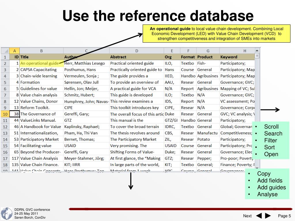 Use the reference database An operational guide to local value chain development. Combining Local Economic Development (LED) with Value Chain Development (VCD) to strengthen competitiveness and integration of SMEs into markets • Scroll • Search • Filter • Sort • Open • Copy • Add fields • Add guides • Analyse