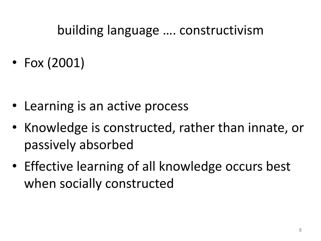 building language …. constructivism • Fox (2001) • Learning is an active process • Knowledge is constructed, rather than innate, or passively absorbed • Effective learning of all knowledge occurs best when socially constructed