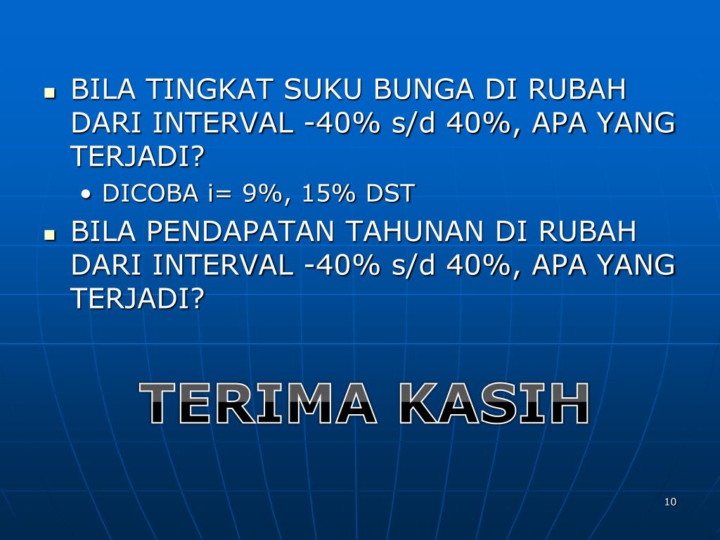 TERIMA KASIH • BILA TINGKAT SUKU BUNGA DI RUBAH DARI INTERVAL -40% s/d 40%, APA YANG TERJADI? • DICOBA i= 9%, 15% DST • BILA PENDAPATAN TAHUNAN DI RUBAH DARI INTERVAL -40% s/d 40%, APA YANG TERJADI?