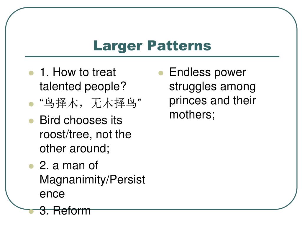 Larger Patterns • 1. How to treat talented people? • “鸟择木,无木择鸟” • Bird chooses its roost/tree, not the other around; • 2. a man of Magnanimity/Persistence • 3. Reform • Endless power struggles among princes and their mothers;