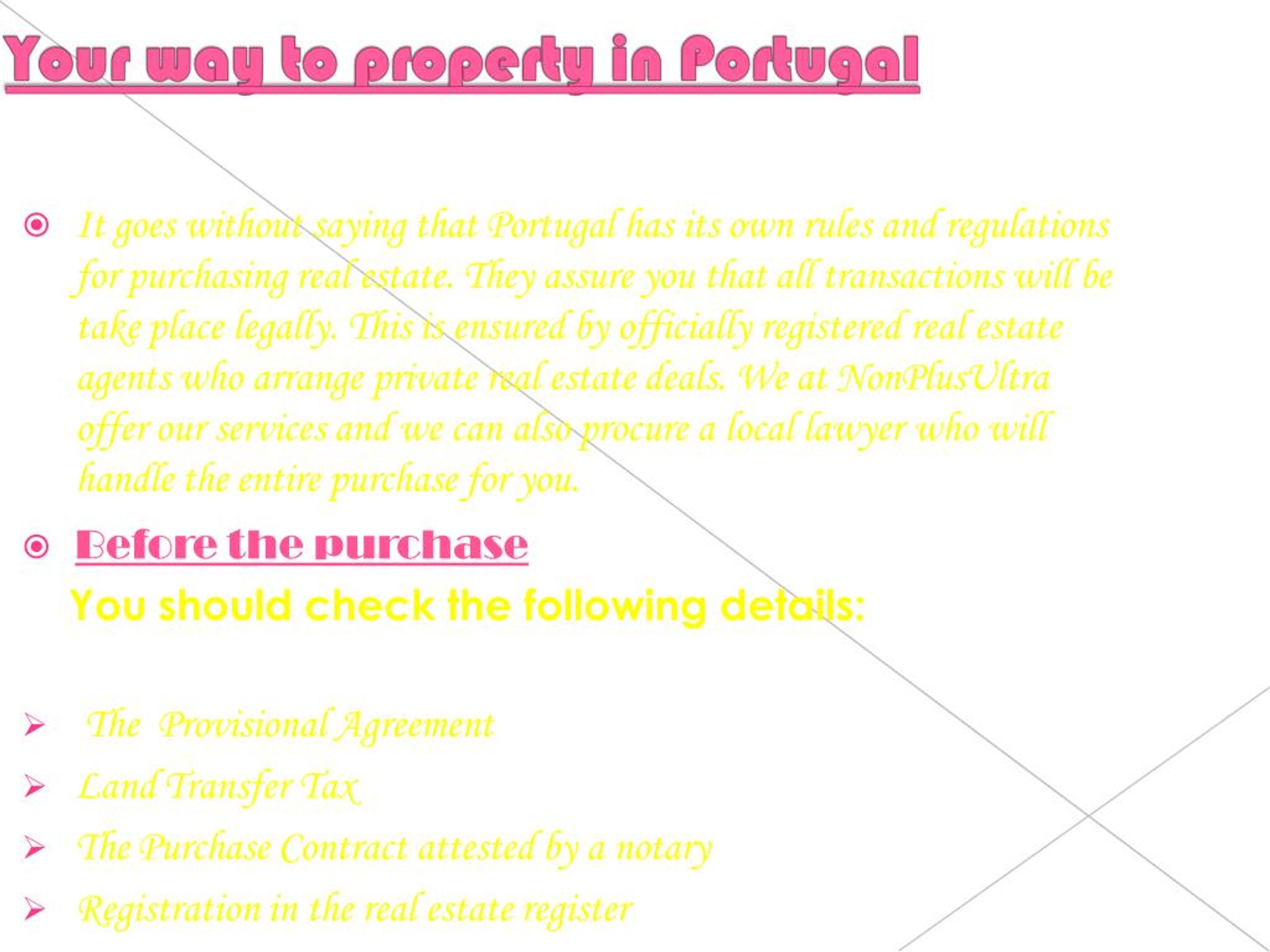 ItgoeswithoutsayingthatPortugalhasitsownrulesandregulationsforpurchasingrealestate.Theyassureyouthatalltransactionswillbetakeplacelegally.Thisisensuredbyofficiallyregisteredrealestateagentswhoarrangeprivaterealestatedeals.WeatNonPlusUltraofferourservicesandwecanalsoprocurealocallawyerwhowillhandletheentirepurchaseforyou.ItgoeswithoutsayingthatPortugalhasitsownrulesandregulationsforpurchasingrealestate.Theyassureyouthatalltransactionswillbetakeplacelegally.Thisisensuredbyofficiallyregisteredrealestateagentswhoarrangeprivaterealestatedeals.WeatNonPlusUltraofferourservicesandwecanalsoprocurealocallawyerwhowillhandletheentirepurchaseforyou. • Beforethepurchase • Youshouldcheckthefollowingdetails: • TheProvisionalAgreement • LandTransferTax • ThePurchaseContractattestedbyanotary • Registrationintherealestateregister
