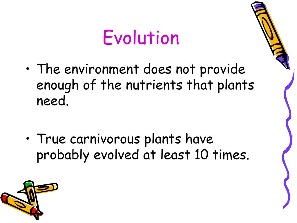 Evolution • The environment does not provide enough of the nutrients that plants need. • True carnivorous plants have probably evolved at least 10 times.