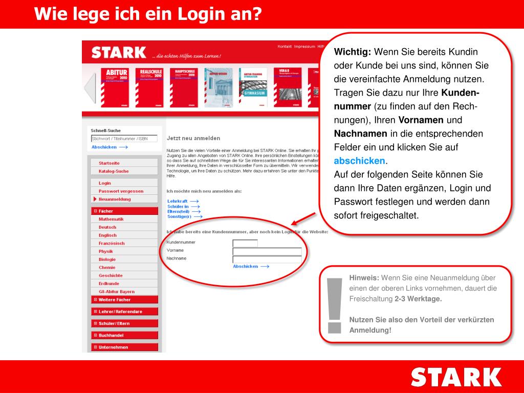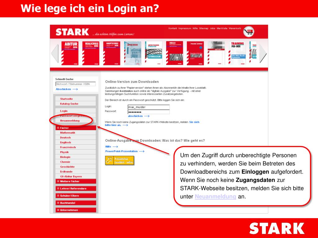 Wie lege ich ein Login an? Um den Zugriff durch unberechtigte Personen zu verhindern, werden Sie beim Betreten des Downloadbereichs zum Einloggen aufgefordert. Wenn Sie noch keine Zugangsdaten zur STARK-Webseite besitzen, melden Sie sich bitte unter Neuanmeldungan.