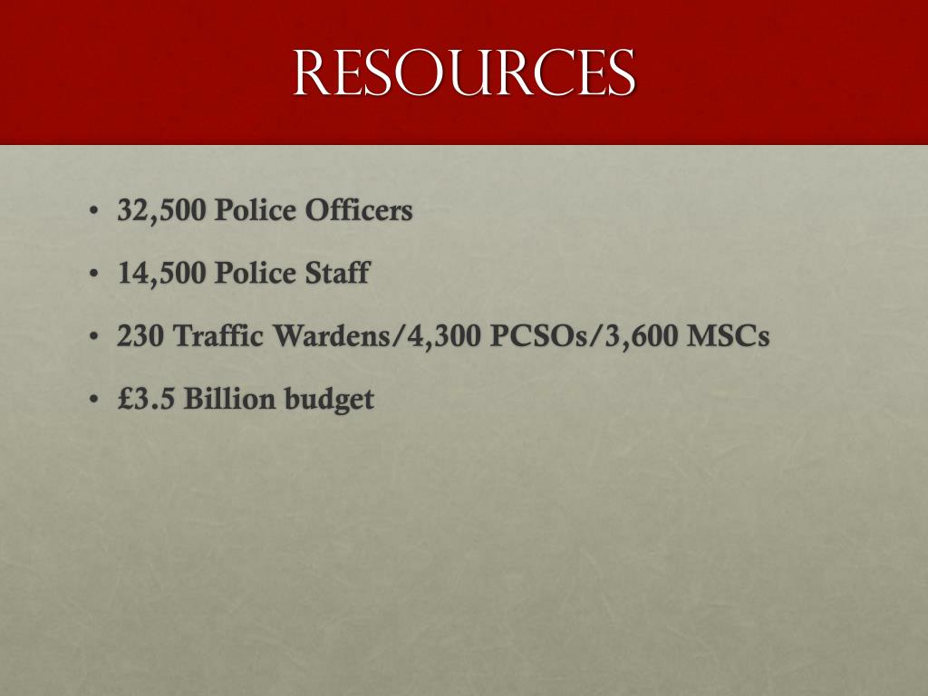 resources • 32,500 Police Officers • 14,500 Police Staff • 230 Traffic Wardens/4,300 PCSOs/3,600 MSCs • £3.5 Billion budget
