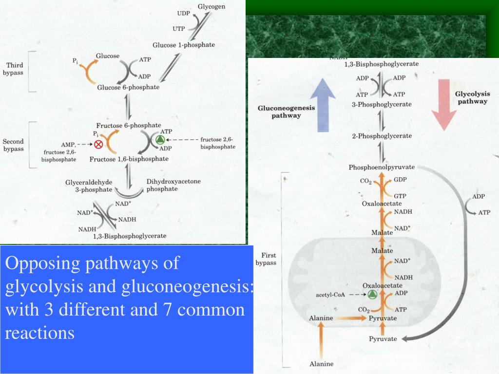 Opposing pathways of glycolysis and gluconeogenesis: with 3 different and 7 common reactions
