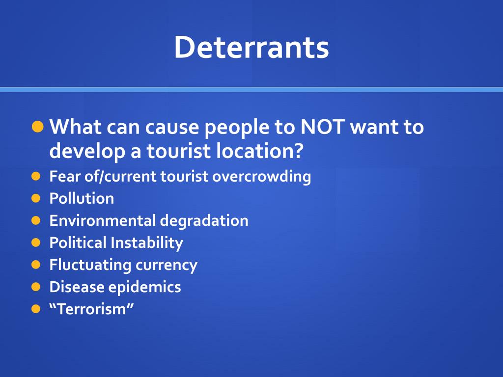 Deterrants What can cause people to NOT want to develop a tourist location? Fear of/current tourist overcrowding Pollution Environmental degradation Political Instability Fluctuating currency Disease epidemics “Terrorism”