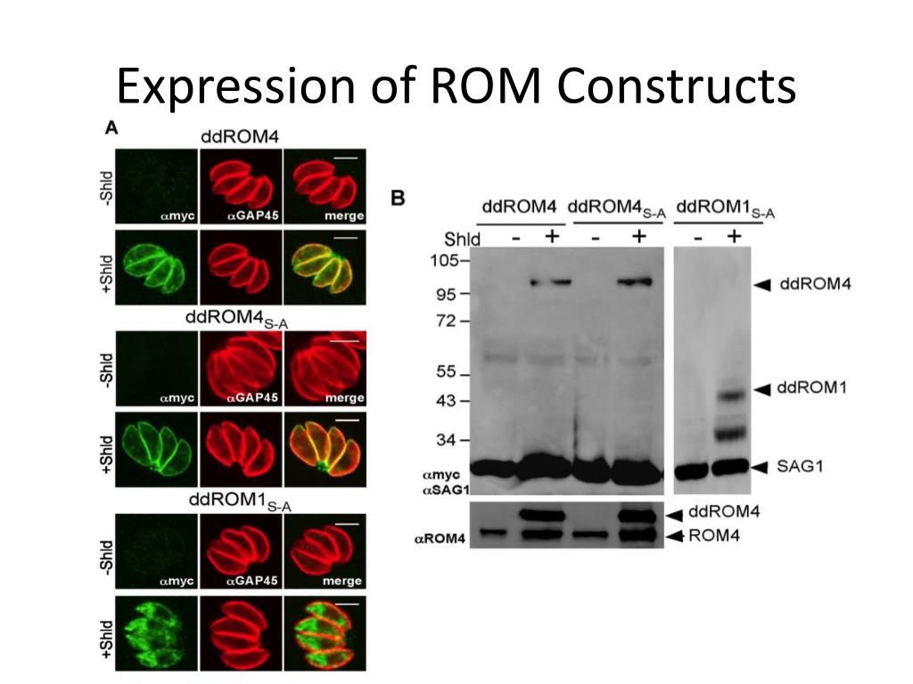 Can ROM4 Defects be Rescued? • A series of AMA1 tails was made using the FKBP/Shld1 system. • Some tails were mutants, one was WT, all shared a sequence thought to be important for function (PSDLMQEAEPS)