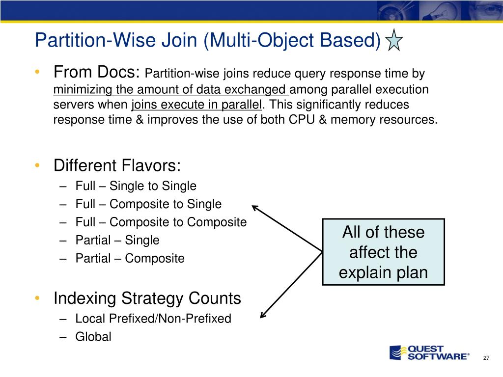 SQL Guidelines Rule #10: Partition Large Tables and Indexes Partition Elimination Partition-Wise Join (requires Parallel too) NOTE: Do not expect that merely partitioning will solve some major performance problem, it should merely make an incremental improvement to a non-partitioned explain plan. Read that as partitioning can make an already good explain plan even better.