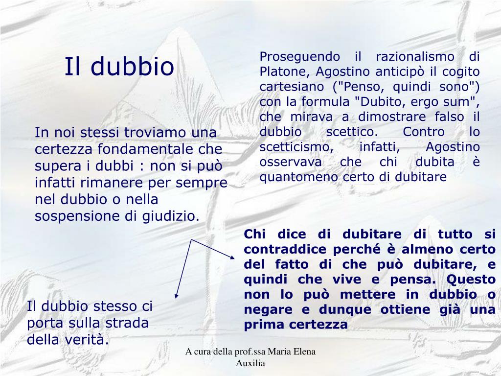 Il dubbio Proseguendo il razionalismo di Platone, Agostino anticipò il cogito cartesiano ("Penso, quindi sono") con la formula "Dubito, ergo sum", che mirava a dimostrare falso il dubbio scettico. Contro lo scetticismo, infatti, Agostino osservava che chi dubita è quantomeno certo di dubitare In noi stessi troviamo una certezza fondamentale che supera i dubbi : non si può infatti rimanere per sempre nel dubbio o nella sospensione di giudizio. Chi dice di dubitare di tutto si contraddice perché è almeno certo del fatto di che può dubitare, e quindi che vive e pensa. Questo non lo può mettere in dubbio o negare e dunque ottiene già una prima certezza Il dubbio stesso ci porta sulla strada della verità. A cura della prof.ssa Maria Elena Auxilia
