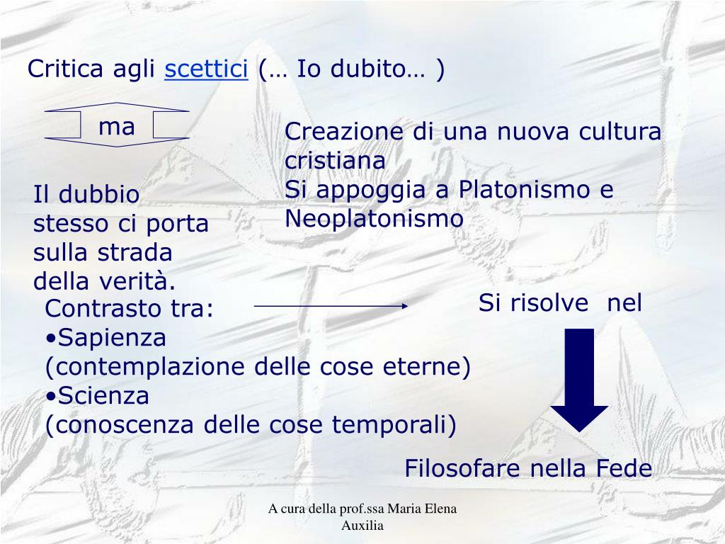 Critica agli scettici (… Io dubito… ) ma Creazione di una nuova cultura cristiana Si appoggia a Platonismo e Neoplatonismo Il dubbio stesso ci porta sulla strada della verità. Si risolve nel • Contrasto tra: • Sapienza • (contemplazione delle cose eterne) • Scienza • (conoscenza delle cose temporali) Filosofare nella Fede A cura della prof.ssa Maria Elena Auxilia
