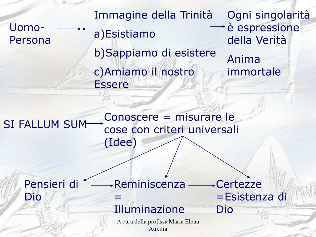Immagine della Trinità a)Esistiamo b)Sappiamo di esistere c)Amiamo il nostro Essere Ogni singolarità è espressione della Verità Anima immortale Uomo- Persona Conoscere = misurare le cose con criteri universali (Idee) SI FALLUM SUM Pensieri di Dio Reminiscenza = Illuminazione Certezze =Esistenza di Dio A cura della prof.ssa Maria Elena Auxilia