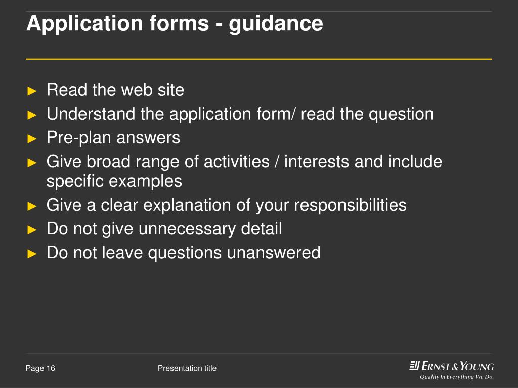 Application forms - guidance • Sell yourself • Be honest • Write a draft • Review your form - could it be improved? • Check accuracy • Submit final copy