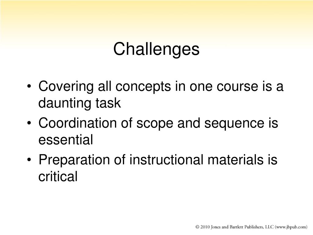 Challenges • Covering all concepts in one course is a daunting task • Coordination of scope and sequence is essential • Preparation of instructional materials is critical