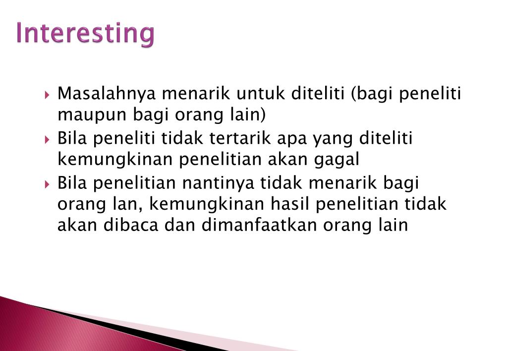 Interesting • Masalahnya menarik untuk diteliti (bagi peneliti maupun bagi orang lain) • Bila peneliti tidak tertarik apa yang diteliti kemungkinan penelitian akan gagal • Bila penelitian nantinya tidak menarik bagi orang lan, kemungkinan hasil penelitian tidak akan dibaca dan dimanfaatkan orang lain
