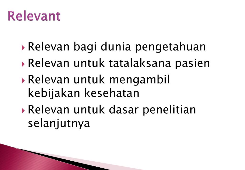 Relevant • Relevan bagi dunia pengetahuan • Relevan untuk tatalaksana pasien • Relevan untuk mengambil kebijakan kesehatan • Relevan untuk dasar penelitian selanjutnya