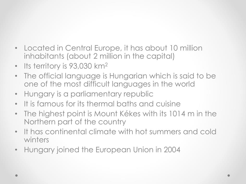 Located in Central Europe, it has about 10 million inhabitants (about 2 million in the capital) • Itsterritory is 93,030 km2 • The officiallanguage is Hungarianwhichissaid to be one of the most difficultlanguages in the world • Hungary is a parliamentaryrepublic • It is famousforitsthermalbathsand cuisine • The highestpoint is Mount Kékes withits 1014 m in the Northern part of the country • It has continentalclimatewith hot summers and coldwinters • Hungary joined the European Union in 2004