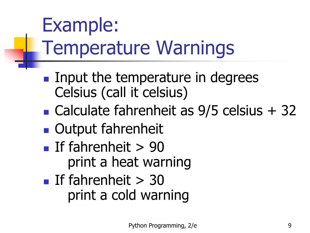 Example:Temperature Warnings • Input the temperature in degrees Celsius (call it celsius) • Calculate fahrenheit as 9/5 celsius + 32 • Output fahrenheit • If fahrenheit > 90 print a heat warning • If fahrenheit > 30 print a cold warning Python Programming, 2/e