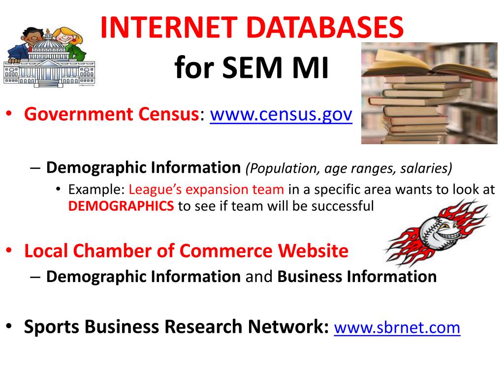 INTERNET DATABASES for SEM MI • Government Census: www.census.gov • Demographic Information (Population, age ranges, salaries) • Example: League’s expansion team in a specific area wants to look at DEMOGRAPHICS to see if team will be successful • Local Chamber of Commerce Website • Demographic Information and Business Information • Sports Business Research Network: www.sbrnet.com