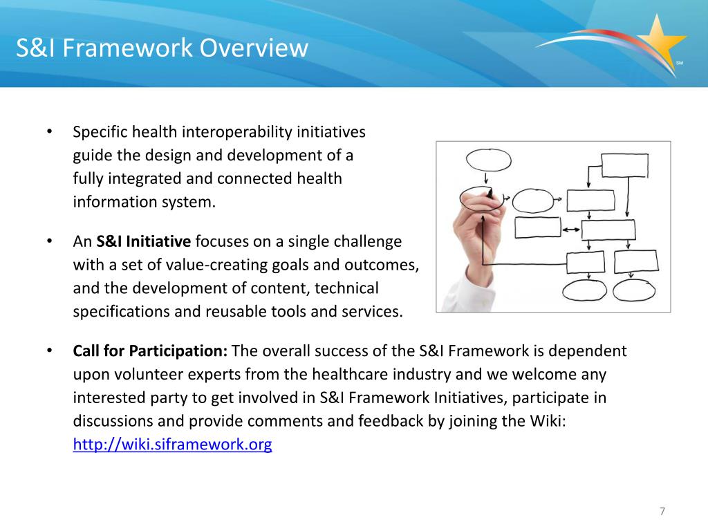 S&I Framework Overview Specific health interoperability initiatives guide the design and development of a fully integrated and connected health information system. An S&I Initiative focuses on a single challenge with a set of value-creating goals and outcomes, and the development of content, technical specifications and reusable tools and services. Call for Participation: The overall success of the S&I Framework is dependent upon volunteer experts from the healthcare industry and we welcome any interested party to get involved in S&I Framework Initiatives, participate in discussions and provide comments and feedback by joining the Wiki: http://wiki.siframework.org