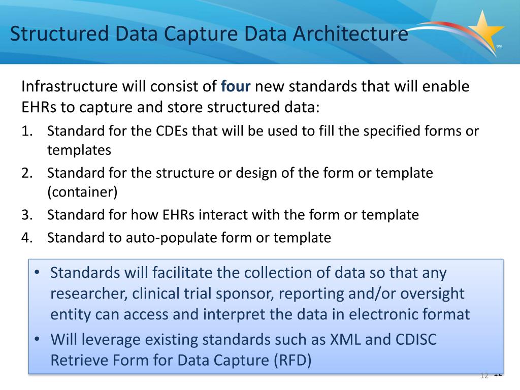 Structured Data Capture Data Architecture • Standards will facilitate the collection of data so that any researcher, clinical trial sponsor, reporting and/or oversight entity can access and interpret the data in electronic format • Will leverage existing standards such as XML and CDISC Retrieve Form for Data Capture (RFD) Infrastructure will consist of four new standards that will enable EHRs to capture and store structured data: • Standard for the CDEs that will be used to fill the specified forms or templates • Standard for the structure or design of the form or template (container) • Standard for how EHRs interact with the form or template • Standard to auto-populate form or template 12