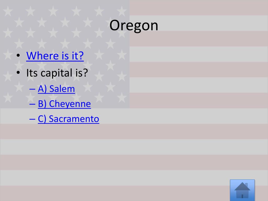 Oregon • Where is it? • Its capital is? • A) Salem • B) Cheyenne • C) Sacramento