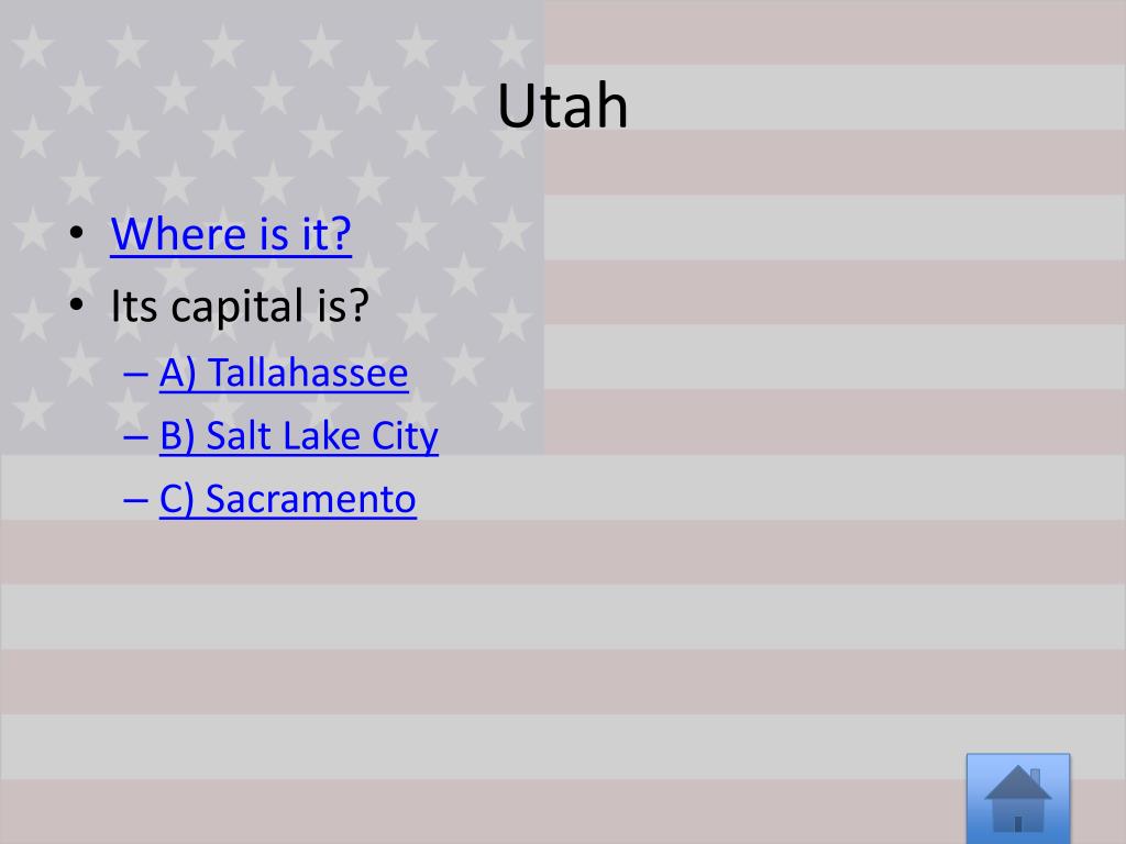 Utah • Where is it? • Its capital is? • A) Tallahassee • B) Salt Lake City • C) Sacramento