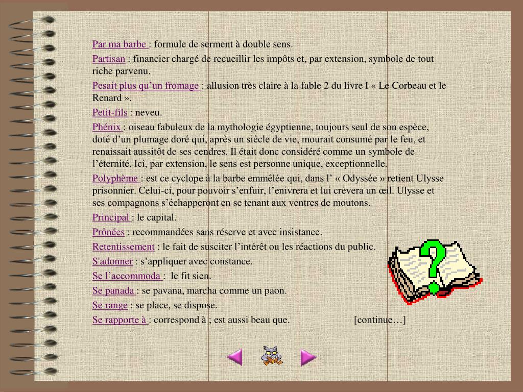 Glossaire Abondamment : eurent bu de l'eau en abbondance. Acharnement : ardeur furieuse. Afin d’en venir : pour en venir à mon fait. Aîné : qui est né le premier par rapport aux frères et soeurs. À l’aide de cette machine: à l'aide de ce procédé. Alléché: c’est la fable elle-même qui lui a apporté une nouvelle vigueur. Apocryphe : dont l’autenticité est au moins douteuse. Avent et Carême : sont des moments de jeûne et de pénitence chez les chrétiens. Donc, ce rat ne jeûnait pas. Berné : désigne initialement le jeu ou la brimade qui consiste à faire sauter quelqu’un dans une couverture tenue aux quatre coins . Bien et beau : bel et bien. Chiches: avares, avides de biens. Croquant: un paysan, un homme du petit peuple qui n’a qu’un croc pour travailler la terre. Cuide engeigner: croit tromper. Décrocher : obtenir. Emprunteuse: le féminin d’emprunteur n’est utilisé que de manière burlesque. Encorné: terme burlesque pour nommer le bouc, animal à cornes. Fretin: tout petit poisson. [continue…]