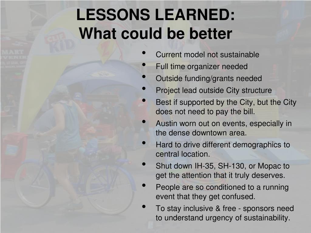 LESSONS LEARNED: What could be better • Current model not sustainable • Full time organizer needed • Outside funding/grants needed • Project lead outside City structure • Best if supported by the City, butthe City does not need to pay the bill. • Austin worn out on events, especially in the dense downtown area. • Hard to drive different demographics to central location. • Shut down IH-35, SH-130,or Mopac to get the attention that it truly deserves. • People are so conditioned to a running event that they get confused. • To stay inclusive &free - sponsors need to understand urgency of sustainability.