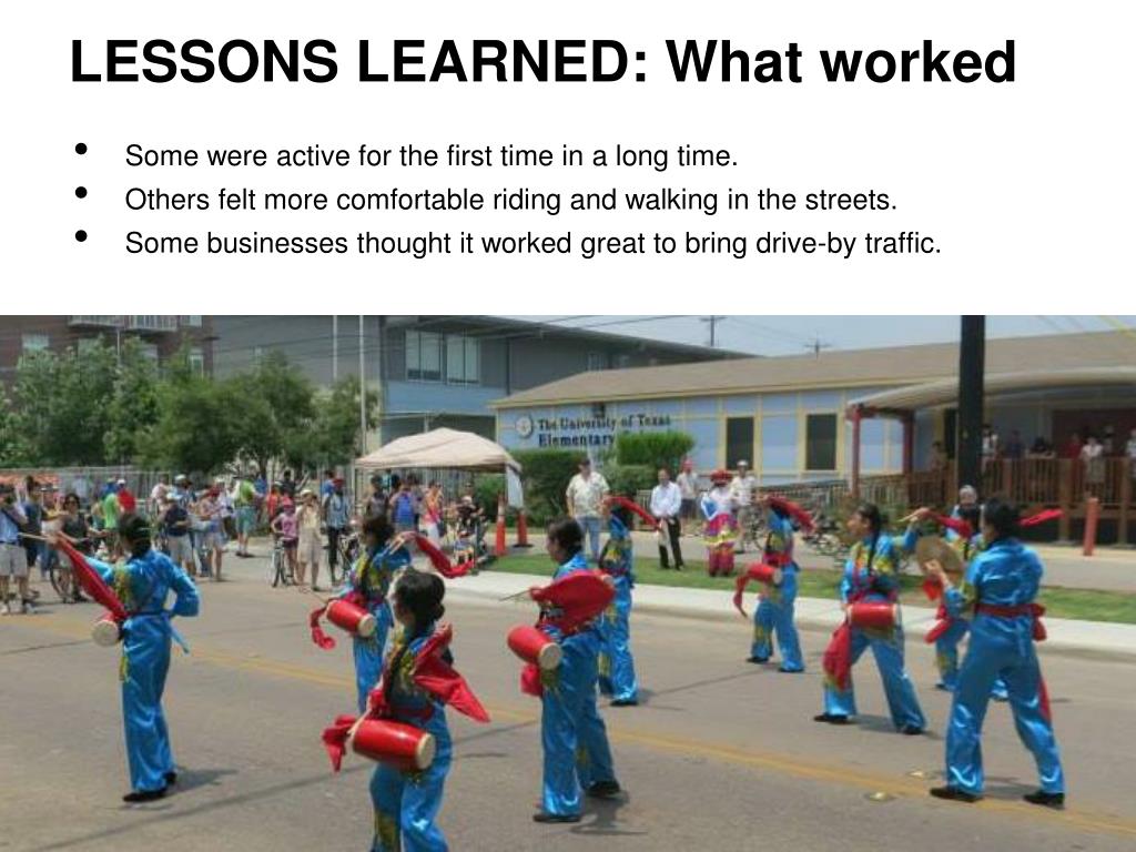 LESSONS LEARNED: What worked • Some were active for the first time in a long time. • Others felt more comfortable riding and walking in the streets. • Some businesses thought it worked great to bring drive-by traffic.