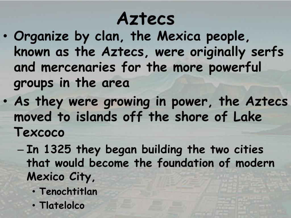 Aztecs • Organize by clan, the Mexica people, known as the Aztecs, were originally serfs and mercenaries for the more powerful groups in the area • As they were growing in power, the Aztecs moved to islands off the shore of Lake Texcoco • In 1325 they began building the two cities that would become the foundation of modern Mexico City, • Tenochtitlan • Tlatelolco