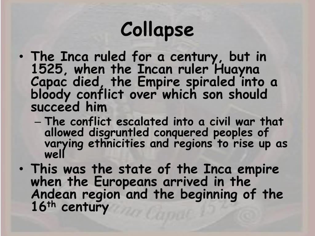 Collapse • The Inca ruled for a century, but in 1525, when the Incan ruler Huayna Capac died, the Empire spiraled into a bloody conflict over which son should succeed him • The conflict escalated into a civil war that allowed disgruntled conquered peoples of varying ethnicities and regions to rise up as well • This was the state of the Inca empire when the Europeans arrived in the Andean region and the beginning of the 16th century
