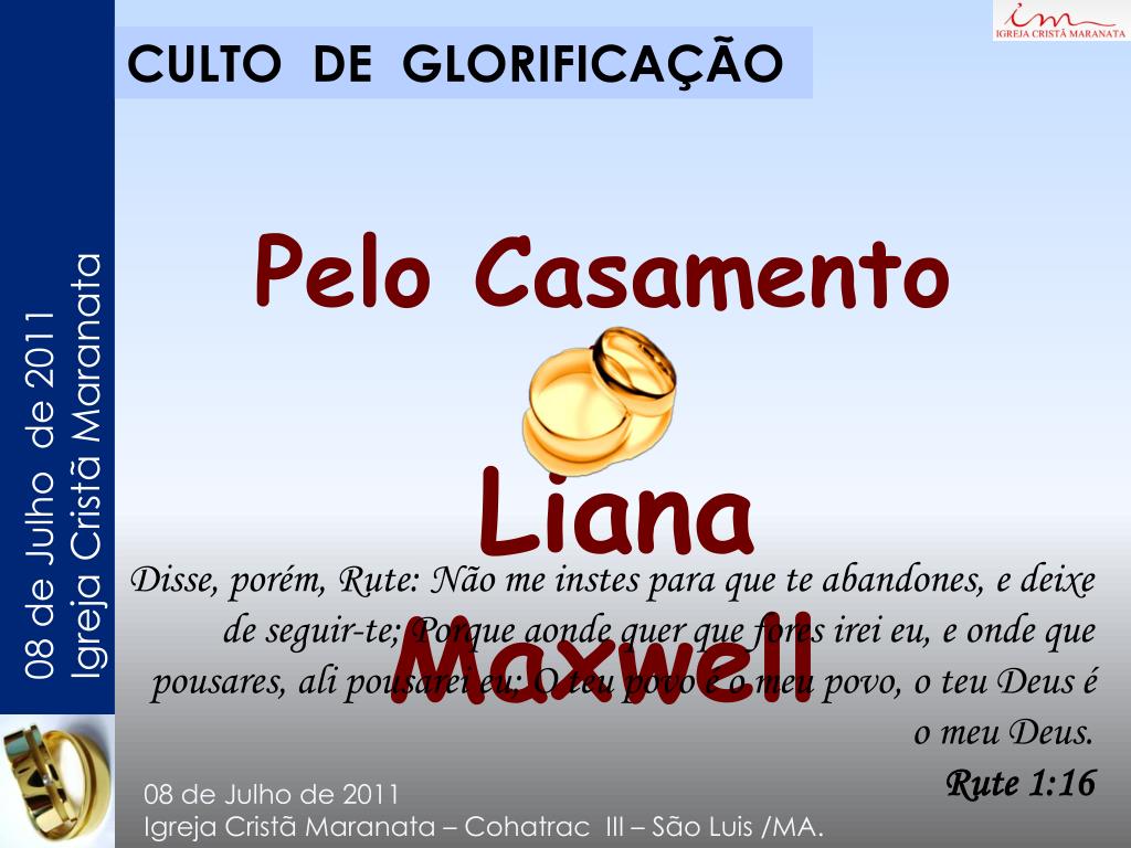 CULTO DE GLORIFICAÇÃO Pelo Casamento Liana Maxwell " Disse, porém, Rute: Não me instes para que te abandones, e deixe de seguir-te; Porque aonde quer que fores irei eu, e onde que pousares, ali pousarei eu; O teu povo é o meu povo, o teu Deus é o meu Deus. Rute 1:16 08 de Julho de 2011 Igreja Cristã Maranata – Cohatrac III – São Luis /MA.