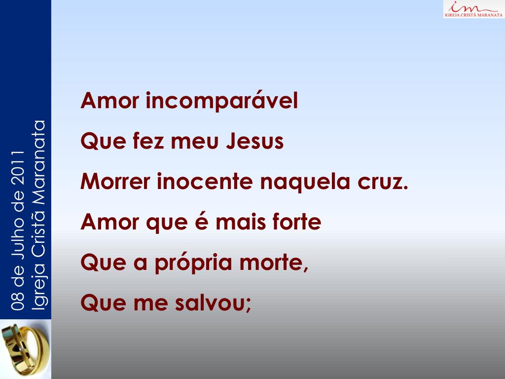 Amor incomparável Que fez meu Jesus Morrer inocente naquela cruz. Amor que é mais forte Que a própria morte, Que me salvou; 08 de Julho de 2011 Igreja Cristã Maranata