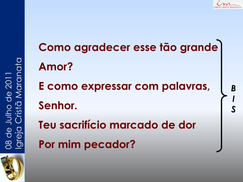 Como agradecer esse tão grande Amor? E como expressar com palavras, Senhor. Teu sacrifício marcado de dor Por mim pecador? B I S 08 de Julho de 2011 Igreja Cristã Maranata