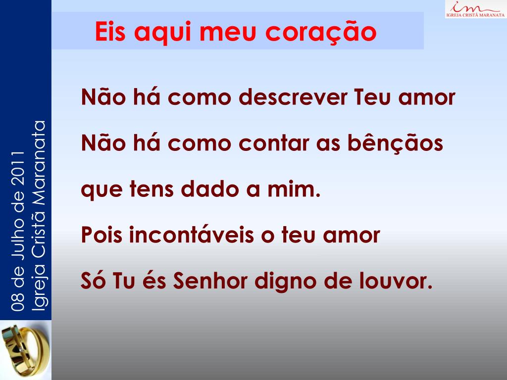 Eis aqui meu coração Não há como descrever Teu amor Não há como contar as bênçãos que tens dado a mim. Pois incontáveis o teu amor Só Tu és Senhor digno de louvor. 08 de Julho de 2011 Igreja Cristã Maranata