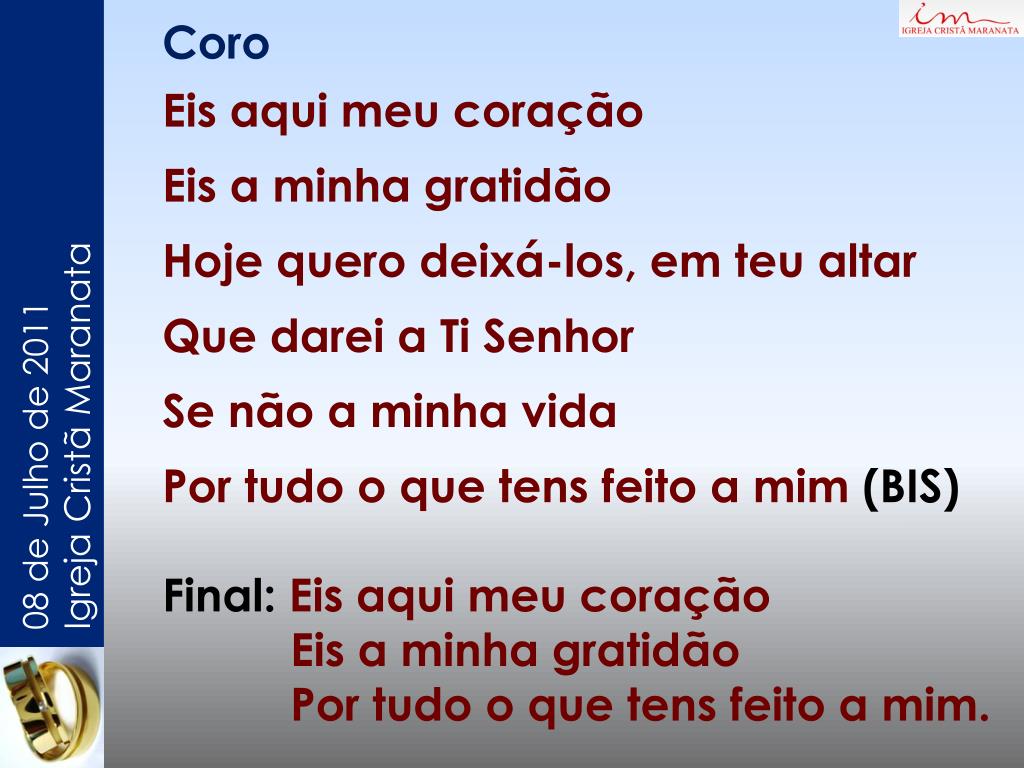 Coro Eis aqui meu coração Eis a minha gratidão Hoje quero deixá-los, em teu altar Que darei a Ti Senhor Se não a minha vida Por tudo o que tens feito a mim. 08 de Julho de 2011 Igreja Cristã Maranata