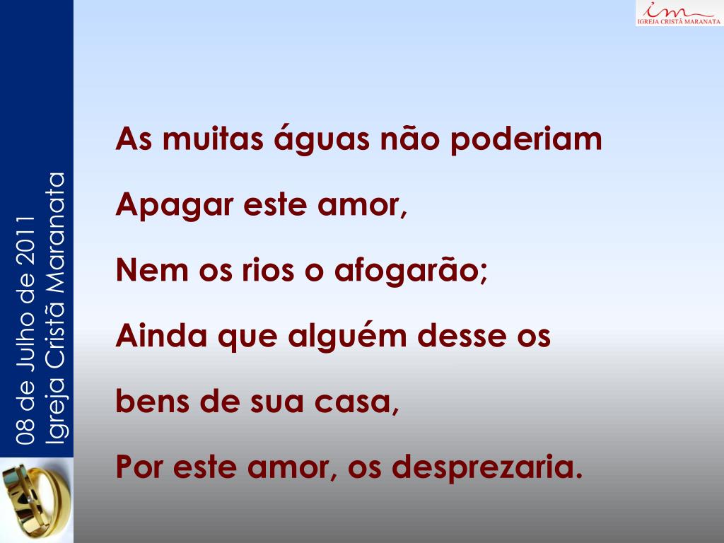 As muitas águas não poderiam Apagar este amor, Nem os rios o afogarão; Ainda que alguém desse os bens de sua casa, Por este amor, os desprezaria. 08 de Julho de 2011 Igreja Cristã Maranata